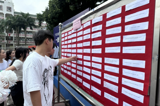 在知识竞赛活动中,同学们争先从展板撕下题目现场作答,领取小奖品,现场氛围活跃。
