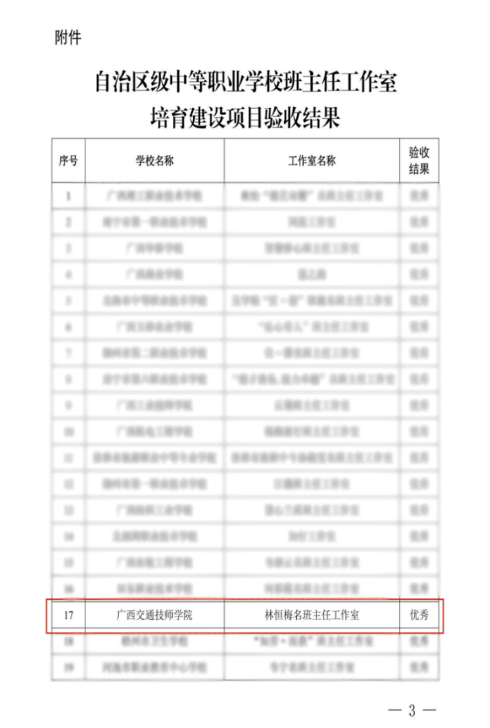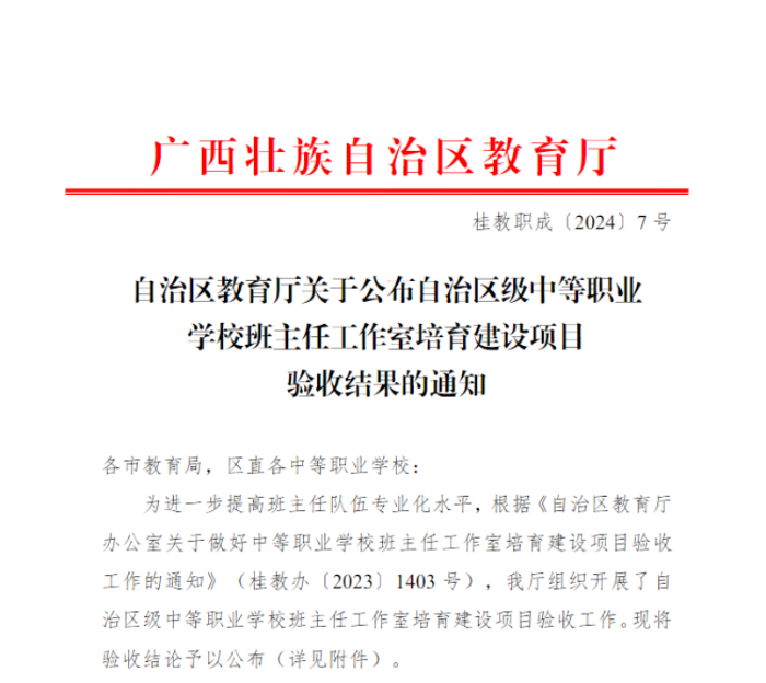 近日,广西壮族自治区教育厅下发了《桂教职成〔2024〕7 号 自治区教育厅关于公布自治区级中等职业学校班主任工作室培育建设项目验收结果的通知》。我院林恒梅名班主任工作室顺利通过验收,且验收结果获得优秀等次。