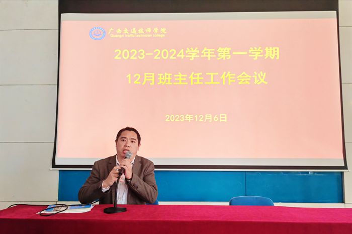 为扎实推进2023年秋季学期学生管理工作,12月6日下午,学院在邕武校区求知楼阶梯教室召开12月班主任工作会议。学院副院长伍阳出席会议并讲话,安全保卫科科长陆佳、各系分管学生管理工作领导和干事、全体班主任、学生工作科工作人员参会,会议由学生工作科科长孙祖德主持。