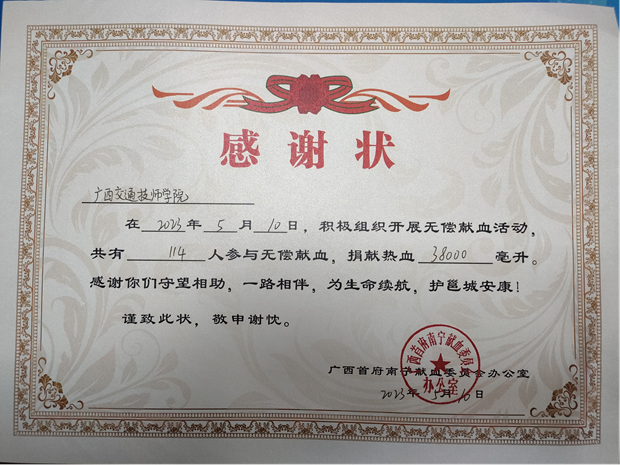5月10日,我院联合南宁市中心血站开展“奉献青春热血 弘扬五四精神”为主题的爱心献血活动,活动共吸引了114名师生踊跃参与,献血量达38000毫升。