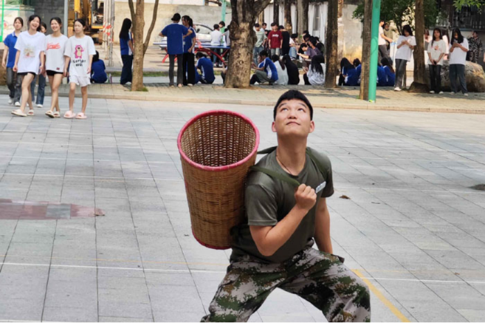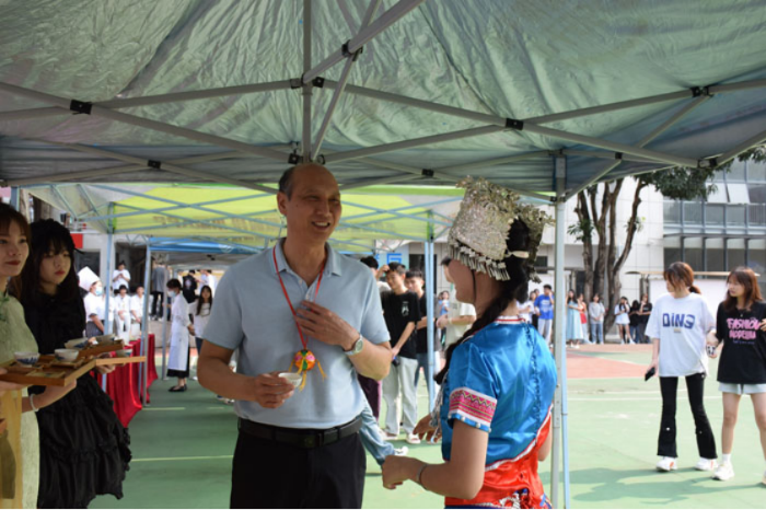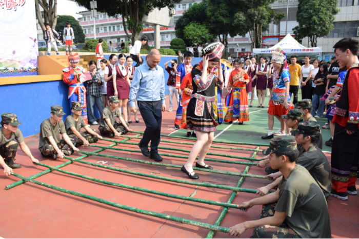 学院副院长黄七零和学生一起体验竹竿舞活动