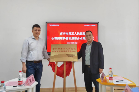 4月12日下午,广西交通技师学院与南宁市第五人民医院(南宁心理医院)签订“心理健康志愿服务”合作协议,共建心理健康科普志愿服务点。学院副院长樊海林、南宁市第五人民医院副院长黄超出席活动并共同揭牌。学院学生工作科副科长韦艳芳及学生工作科心理辅导员、南宁市第五人民医院医务社工部主任范喜英及职工代表参加活动。