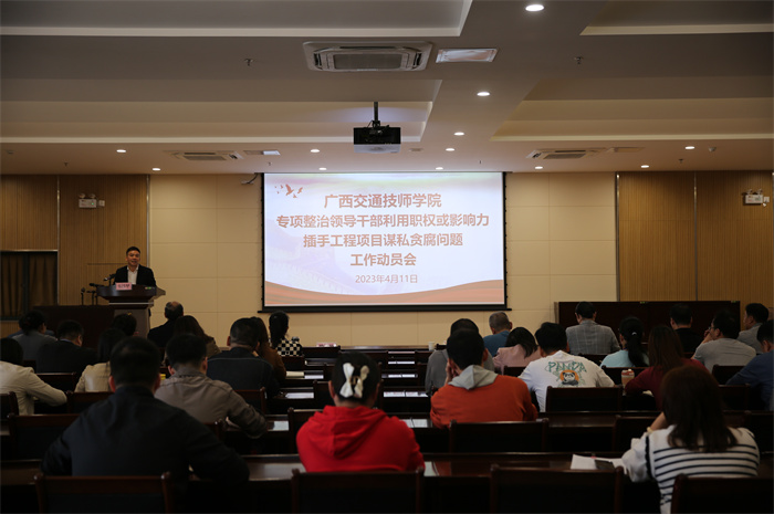 4月11日下午,广西交通技师学院“专项整治领导干部利用职权或影响力插手工程项目谋私贪腐问题工作动员会”在综合楼1619会议厅召开。党委书记赖国秋作动员讲话,党委副书记、纪委书记韦昌甲主持会议,学院在家院领导、全体中层领导干部、规划建设办全体人员、资产中心全体人员、后勤服务科负责资产管理及维修管理人员、各教学系部采购人员约60多名干部职工参加会议。