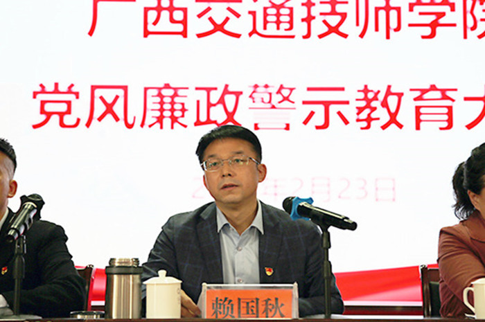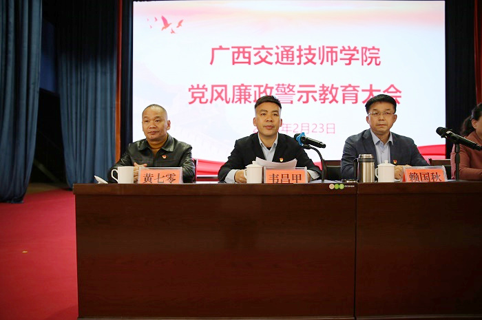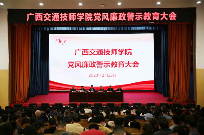 2月23日下午,广西交通技师学院党风廉政警示教育大会在邕武校区礼堂召开,党委书记赖国秋作警示教育讲话,学院院长刘芳主持会议,党委副书记、纪委书记韦昌甲宣读自治区交通运输厅党组处分文件,全院300多名教职员工参加了会议。
