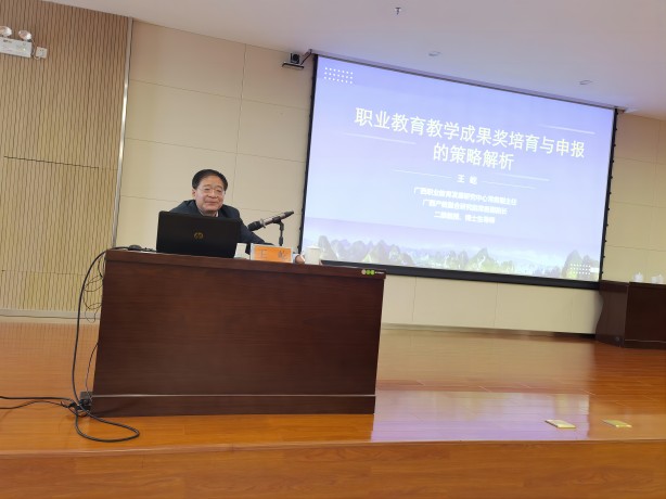 1月10日,学院特邀广西职业教育研究中心王屹教授作“职业教育教学成果奖培育与申报”专题培训。学院党委书记赖国秋作动员讲话,副院长樊海林主持培训会。各部门负责人、骨干教师、专业带头人等80余人参加培训。