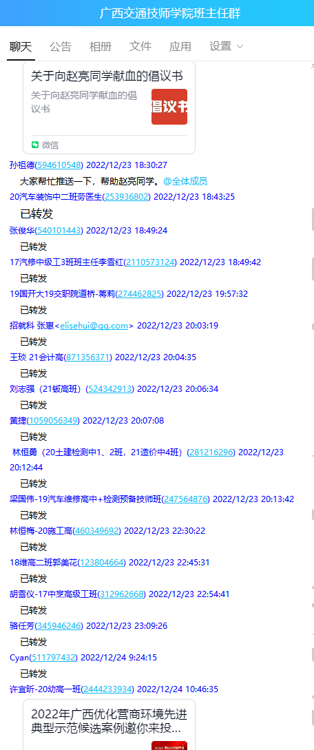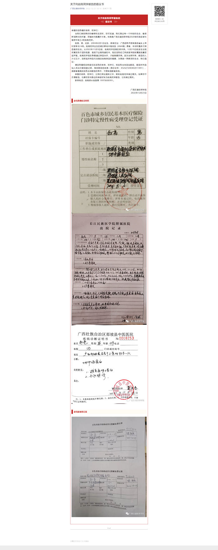 12月23日下午16时左右,学院2020级机电中级工2班班主任陆丹丹老师收到赵亮家长的求助信息,得知赵亮同学在家因患地中海贫血和感染新冠病毒,送到百色右江民族医学院附属医院救治。因病情严重,医院下达了病危通知书,急需3000毫升鲜血进行换血救治,而当地临床用血无法满足救治需要,急需百色当地的人们献血救急。