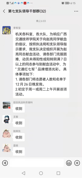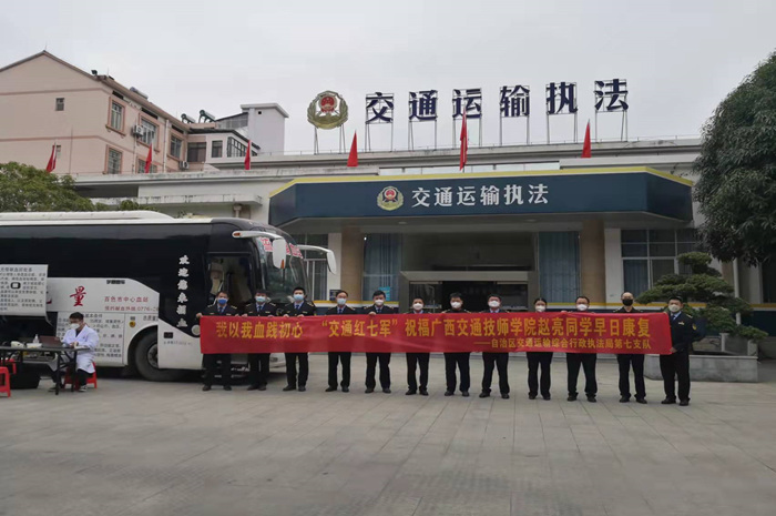此次倡议筹集献血是一项抢救生命接力赛,是充分展现一方有难、八方支援的生动诠释。在这一项接力赛中,得到了全院师生的大力支持,得到了百色当地人们的鼎力相助。在此特别要感谢自治区交通运输厅综合执法第七支队,他们得知情况后,统一行动,克服疫情,积极响应,为赵亮同学成功献血2400毫升,为后续赵亮同学换血治疗储备好生命血库。