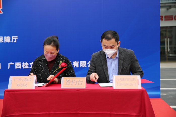 开幕式上,学院院长刘芳与郑州捷安高科股份有限公司副总经理周松签订校企合作协议,参会领导、嘉宾为技术支持单位赠与牌匾,裁判员代表、参赛选手代表分别上台进行宣誓。