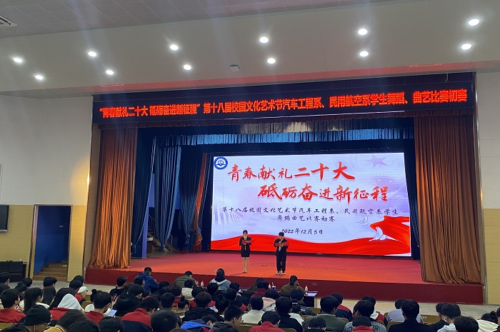 12月5日晚,汽车工程系团总支于在学院礼堂举办“青春献礼二十大 砥砺奋进新征程”第十八届校园文化艺术节汽车工程系、民用航空系学生舞蹈曲艺比赛初赛。汽车工程系团总支书记李润邦、副书记顾钟秀,汽车工程系教师罗万庆、姚滕,民用航空系教师石文静、周海华作为评委嘉宾参加此次比赛的评审工作。
