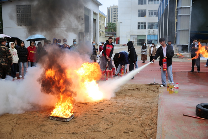 演练现场,学生们在老师及教官的指引下,用湿毛巾捂住口鼻,弯腰慢跑,从宿舍、教学楼等地有序撤离,到达安全地点。在消防人员的指导下,学院师生现场体验灭火器实操,增进对消防器材的使用方法的了解。同时,消防人员还结合学院的实际情况,介绍了学院消防安全的重点注意事项。