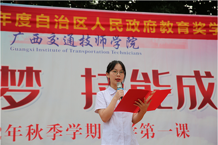 21级汽车营销专业中级工班覃允儿同学作题为“立足专业,成就职业梦想 ”的国旗下讲话。鼓励同学们热爱自己的专业,在专业学习上做到认真勤恳,一丝不苟;在训练过程学会如何发现问题、解决问题,如何随机应变、沉着冷静的应对;始终相信自己,不懈的努力加上合适的方法,一定会让自己学有所得,学有所获,学有所长。