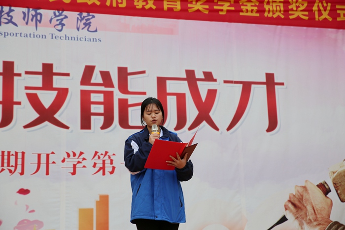 信息工程系2021级现代物流中级工班龙佳娴在颁奖仪式上发言。她向一直以来关心、教育和帮助我们成长成才的各位领导、老师表示最真挚的感谢和最崇高的敬意。表示,今后将脚踏实地,潜心钻研,夯实基础,既要掌握知识本领、身怀一技之长,也要积淀职业素养,牢固树立敬业守信、精益求精的职业精神。