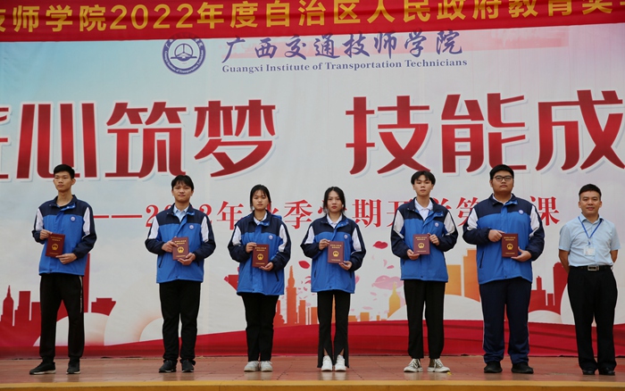 为了全面贯彻党的教育方针,鼓励学生刻苦学习,学院积极推进资助育人工作,组织开展2021-2022学年自治区人民政府中等职业教育奖学金评定工作,龙佳娴、邓先泉、富俊、陈武佳、邓文静、陆昊等156名同学获自治区人民政府奖学金。11月28日上午,学院在灯光球场举行2022年自治区人民政府奖学金颁奖仪式。学院党委副书记、纪委书记韦昌甲为获奖学生代表颁奖,全体师生参加颁奖仪式。