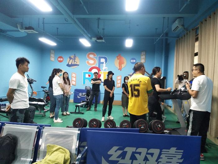 教职工在听教练讲解并亲自体验健身器材
