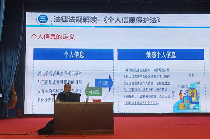 广西工信厅信息安全测评中心产学研基地副主任赵洪刚围绕“网络安全为人民,网络安全靠人民”的主题,通过具体案例和理论知识,从网络安全发展趋势、网络安全法律法规解读、网络信息安全等方面向大家介绍如何提高网络安全意识,提醒教职工和同学们要提高警惕,擦亮双眼,分辨真伪,加强网络安全意识。