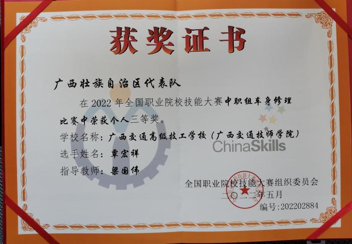 【强国复兴有我】我院覃宏祥同学荣获2022年全国职业院校技能大赛(中职组)车身修理赛项三等奖