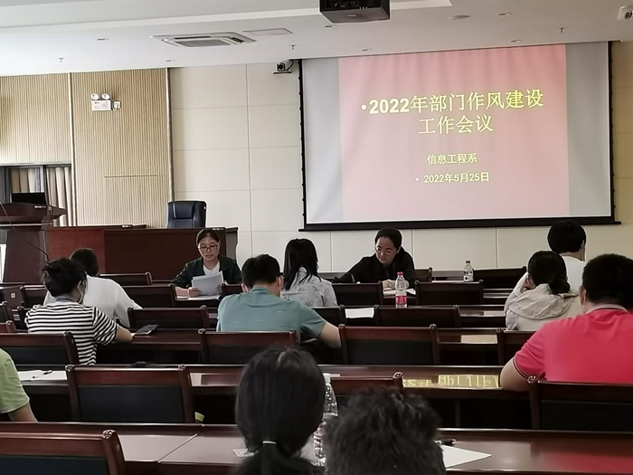 5月25日下午,广西交通技师学院信息工程系在综合楼1619会议室召开2022年部门作风建设工作会议,信息工程系副主任张庆梅作工作部署,副主任罗莎领学习近平关于作风建设的重要论述,信息工程系全体教职员工参加本次会议。