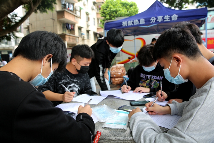 献血者佩戴好口罩,在活动现场排成一条长队,跟随南宁市中心血站工作人员的指引,有序进行登记填表、化验血型、采集血样,整个献血过程严格按照疫情防控要求进行。