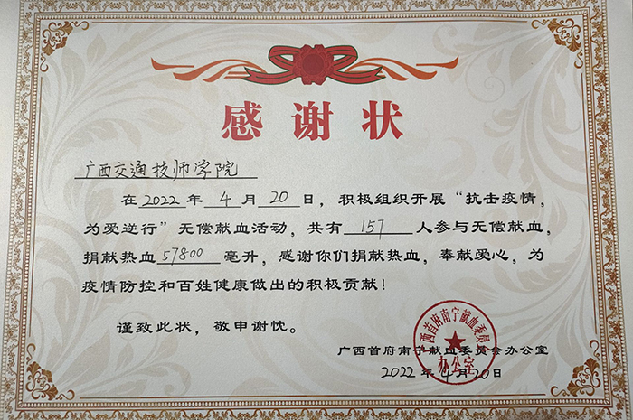 4月20日,我院联合南宁市中心血站开展“芳菲四月热血情 献血奉献正当时”爱心献血活动,引导学院师生用实际行动践行党史学习教育成果,厚植爱党、爱国、爱社会主义的情感和社会责任感,弘扬奉献、友爱、互助、进步的志愿者精神。