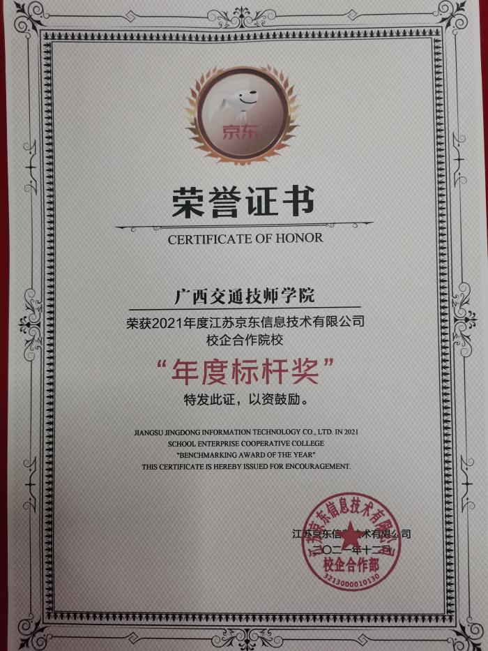 广西交通技师学院2021年度京东校企合作标杆奖荣誉证书