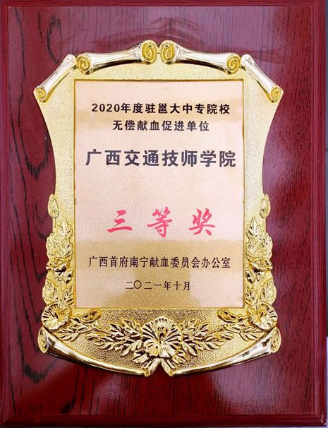11月5日,南宁市中心血站开展“凝心聚力 热血领航”驻邕大中专院校联谊活动。广西首府南宁献血委员会办公室对2020年促进无偿献血事业持续健康发展的中高职院校给予表彰,我院荣获2020年驻邕大中专院校无偿献血促进单位三等奖。