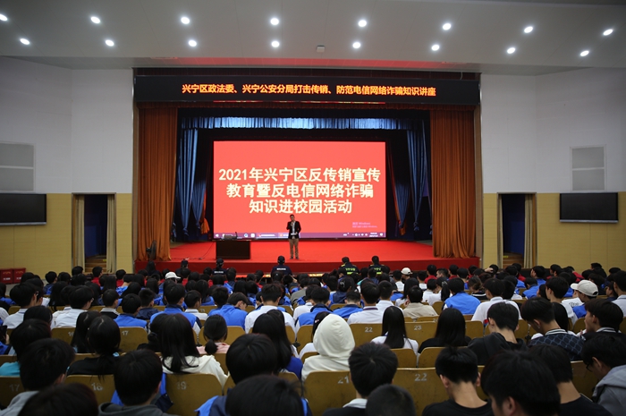 为增强学生法律意识,强化校园综合治理、创建平安校园,进一步营造安全、稳定、和谐的校园,11月3日,我院邀请南宁市兴宁区公安分局祁玮、颜诗琳,邕武派出所社区民警尹水华,兴宁区打击传销专业队副队长潘尔维及社区工作人员到邕武校区礼堂开展“打击防范传销及电信网络诈骗”知识讲座,共计有1000名2021级新生参加活动。