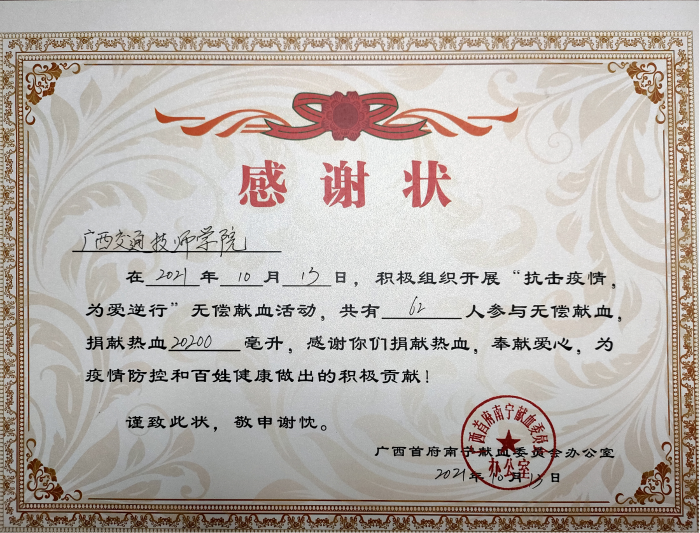 为深入贯彻落实习近平总书记在党史学习教育动员大会上的重要讲话精神,以实际行动助推党史学习教育走深走实。10月13日,我院联合南宁市中心血站开展“我为祖国献热血 我为党旗添光彩”为主题的爱心献血活动,广大师生踊跃报名参加,最终共有62人参加,献血量达20200毫升。