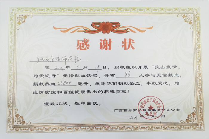 5月19日下午,我院配合南宁血站组织开展了“学党史强信念 争当热血好青年”爱心献血活动,用无偿献血实践活动引导学院师生厚植爱党、爱国、爱社会主义情怀,让红色基因、革命薪火代代传承。