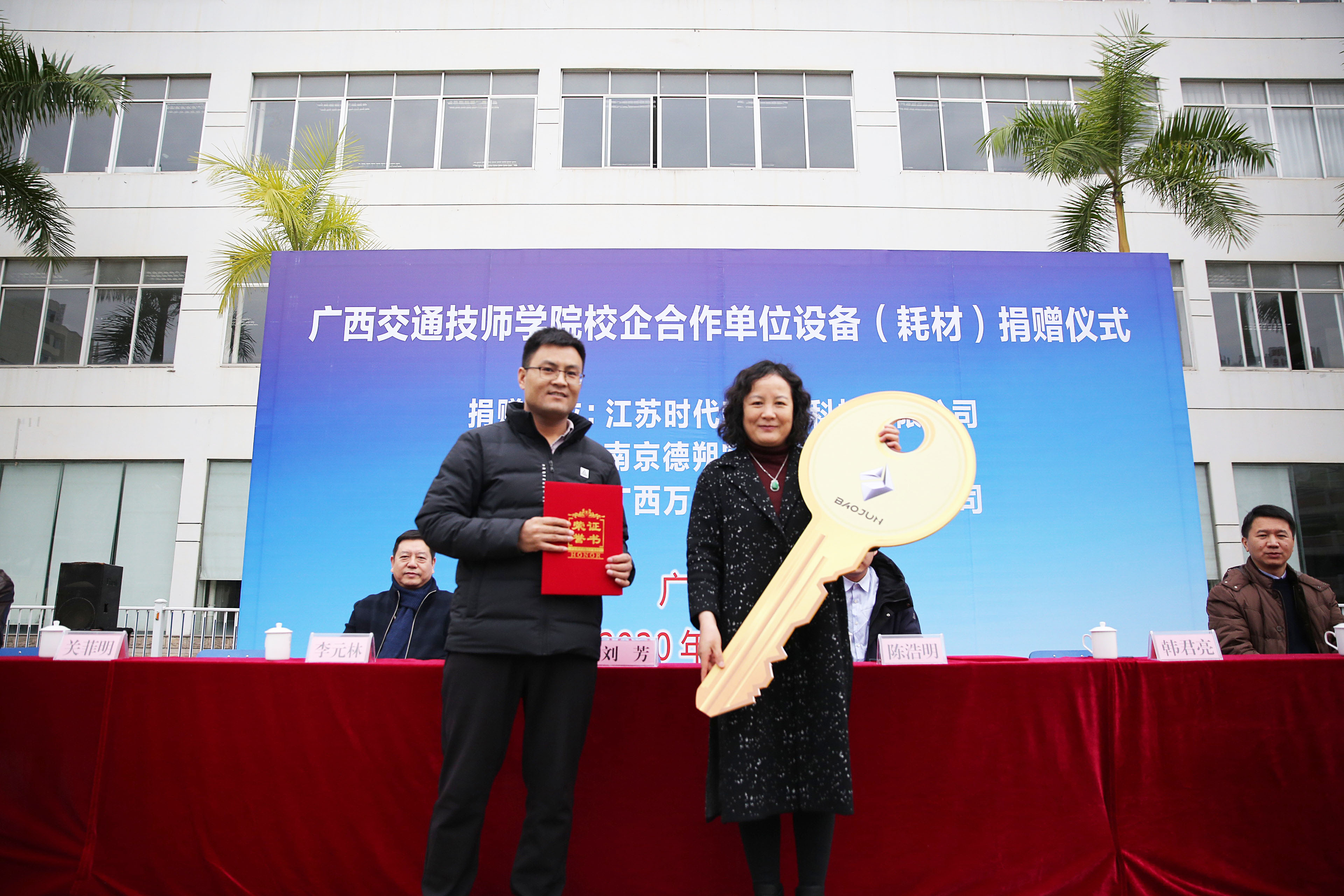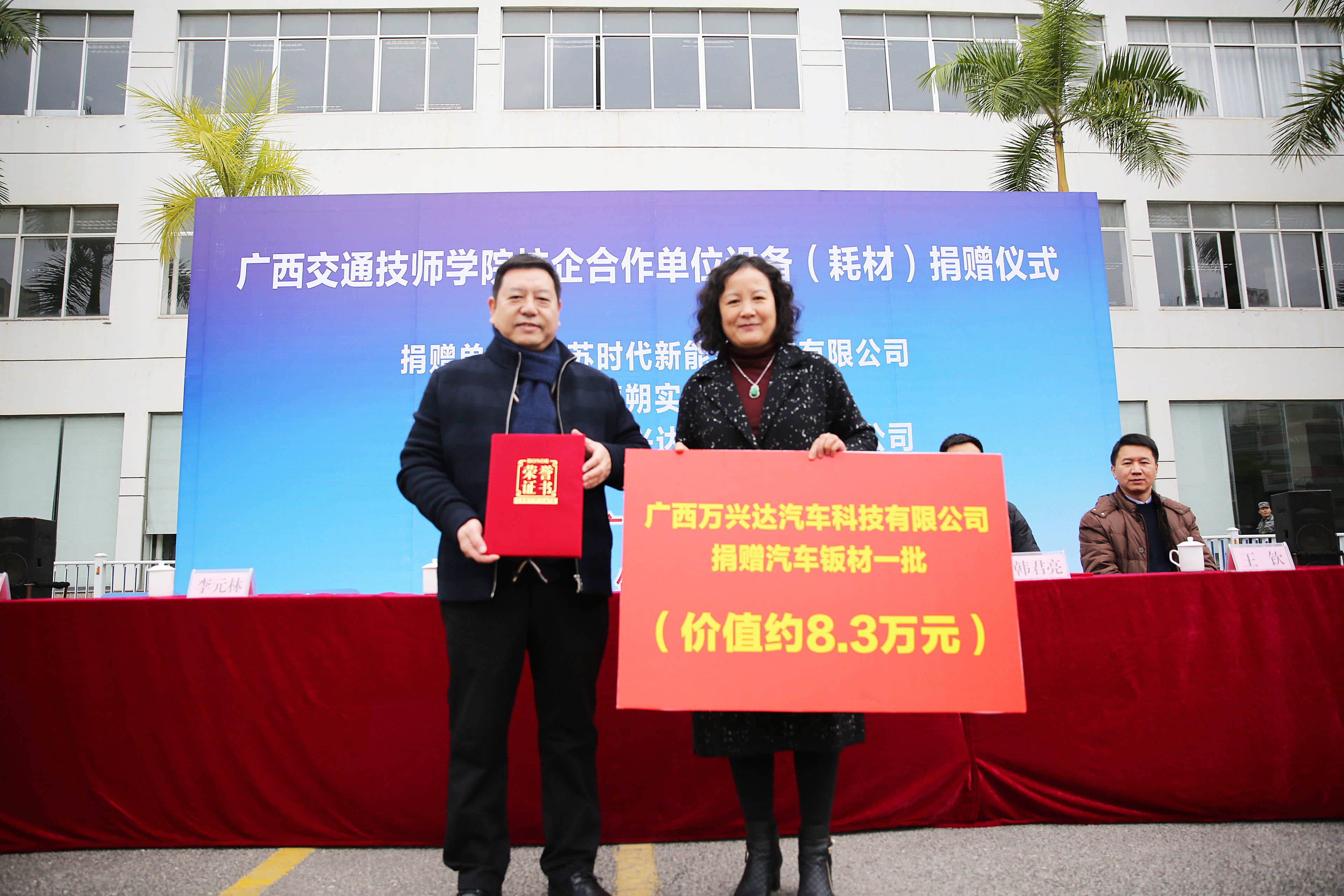 在此次捐赠仪式上,分别有江苏时代新能源科技有限公司和南京德朔实业有限公司向我院捐赠了3台新能源教学用车,广西万兴达汽车科技有限公司向我院捐赠了一批价值约8.3万元的汽车钣金实训耗材。学院接受了企业的捐赠,并为企业颁发了捐赠证书。