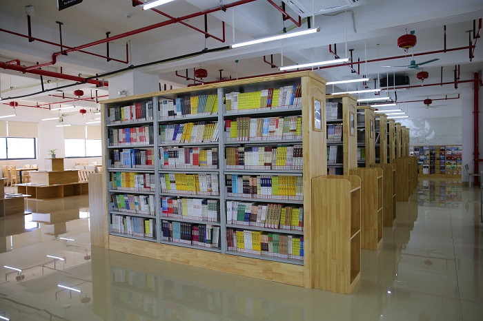 学院图书馆为电子信息化管理的现代型图书馆,面积总计1400平方米,内设休闲阅读区、研习讨论区、多媒体会议影视空间、电子阅览室等空间服务区域,配备了自助借还机、电子查询机、朗读亭、智能书法台、激光电视、投影仪、光能黑板、交互一体机等设备,现代化程度高,给师生们提供了既清静优雅又具时尚感、现代感的学习与交流的空间。