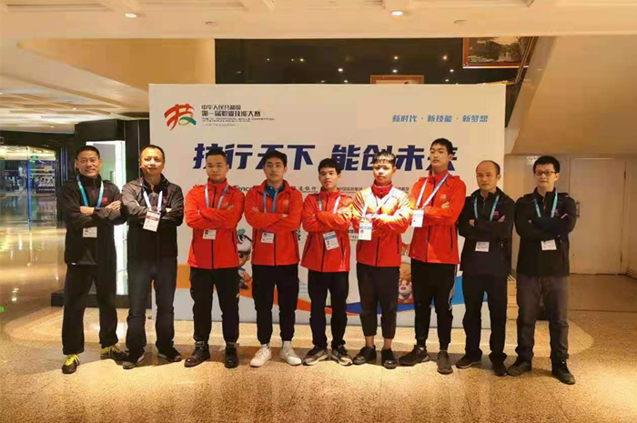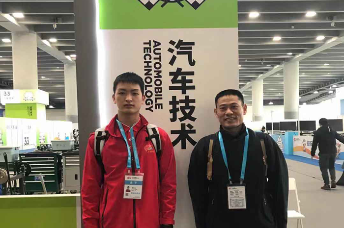 代表学院参加全国第一届职业技能大赛的黄世森选手和教练代表覃强老师