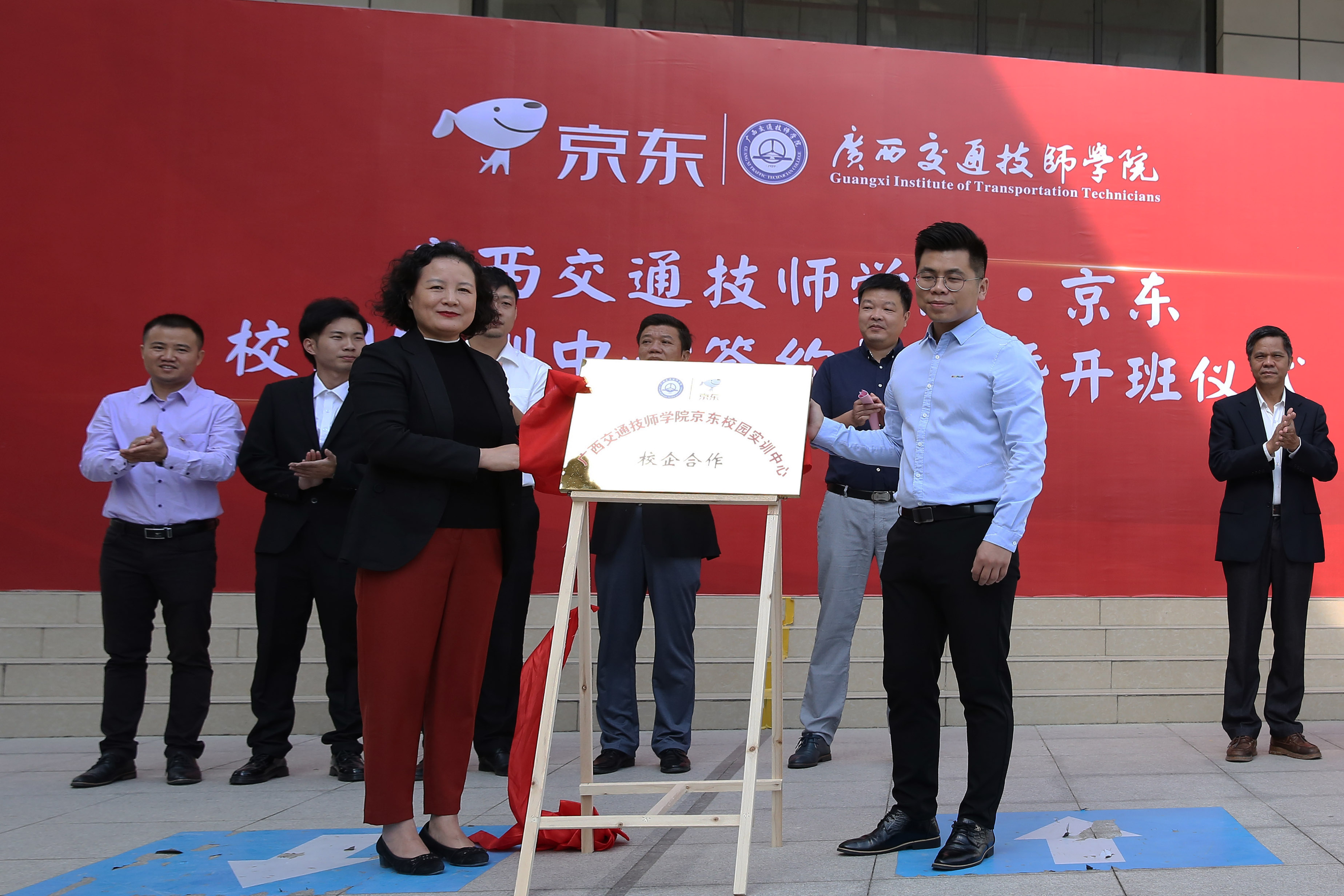 随后,京东全国客户服务中心校园运营部副总经理毕强和广西交通技师学院副院长刘芳共同为“广西交通技师学院京东校园实训中心”揭牌。