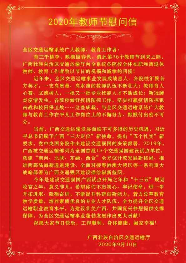 9月9日上午,第36个教师节到来之际,自治区交通运输厅副厅长胡华平、科教处副处长韦扬、副调研员张迎春莅临我院开展教师节慰问活动并召开教师座谈会。学院领导班子及部分优秀教师代表参加了座谈会。