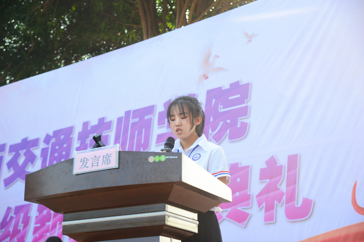 代表们的发言迎来全场热烈掌声,随后,学院党委书记古雅明对新生提出了几点期望,第一是,我们要走技能报国、技能强国之路,要常怀爱国之心,努力学习,将知识转化为力量,锻炼自己保家卫国的本领;第二是,要争当品德高、技能强、身体棒全面发展的高技能人才;第三是,鉴定理想,追求信念,立足当前,追求自我劳动意识,树立爱岗敬业精神,从严、从高要求自己,学好技能,建设祖国。