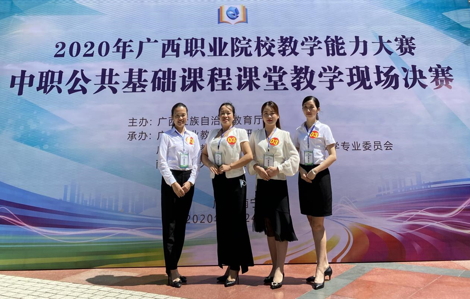 黎屏、赵霞飞、覃卫宁、梁志芬教师团队的参赛作品《设景激趣,润物无声——幼儿情景英语教学设计》入围中职公共基础课程组决赛,黎屏教师团队以精彩的现场教学和良好的教师风貌取胜,荣获中职公共基础课程组二等奖。