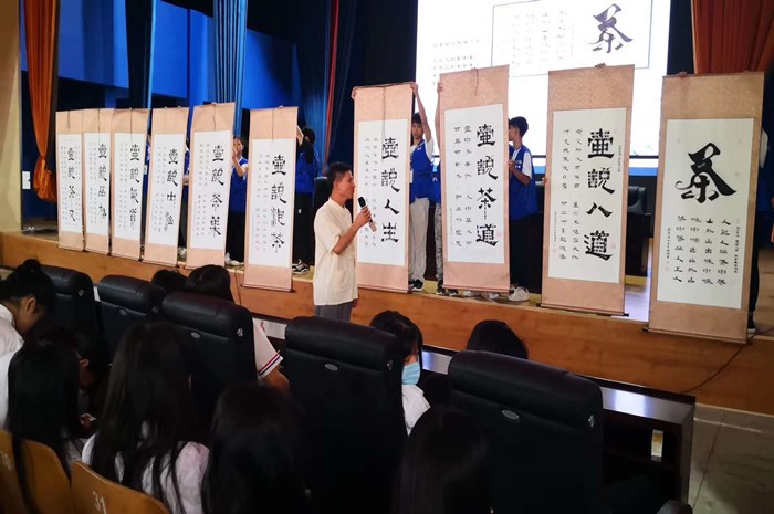 唐铭会长向学生介绍并展示了一套完整的《壶说人生》、《壶说茶道》、巜壶说八道》等九幅完整的茶文化系列书法作品,向学生深入浅出地讲解了我国博大精深的茶文化和茶道养生知识,这种互动式的体验,让同学们兴趣倍增、收获颇丰。本次讲座不仅展示了中华传统文化之美,也增长了同学们的茶文化知识,使同学们在茶艺的魅力中沟通思想、放松身心,提升了对修身养性的感悟和理解。