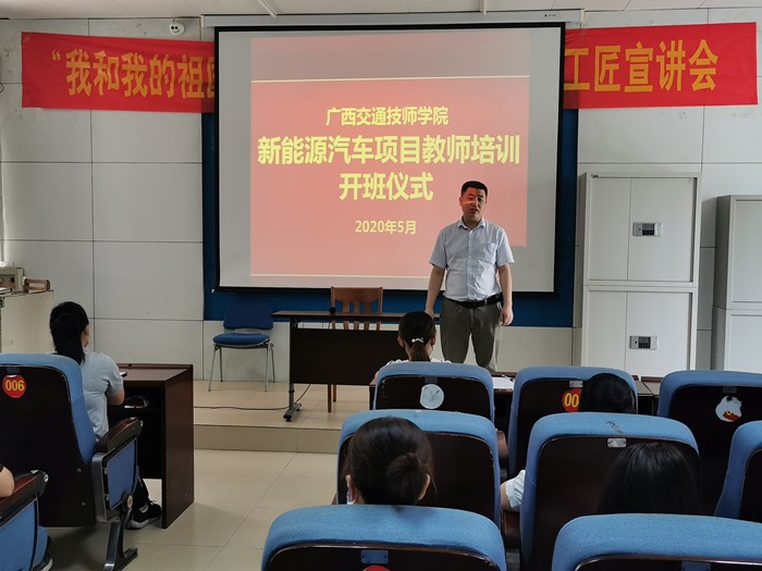 5月29日李宣葙大师工作室组织了开班仪式,汽车工程系王尧飞副主任在开班仪式上致词。会议上王副主任首先向各位参会教师明确了本次培训的目的和意义,严肃了培训纪律和考核要求,并对授课教师提出了授课方向和标准,最后对全体教师提出了培训的期望:期望教师们能够从培训中获取更多的新能源汽车技术知识,选拔出优秀人才,在即将开始的新能源汽车技术大赛中获得优异的成绩。
