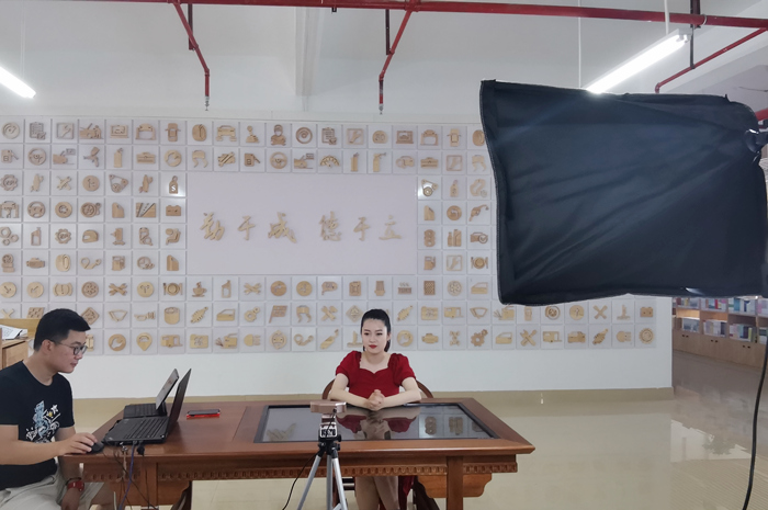 本次直播在学院图书馆进行,主持人黄颖老师在做直播前的最后调试