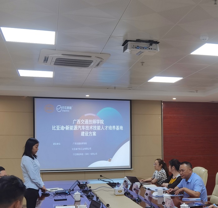 5月19日上午,行云新能(深圳)科技有限公司总经理吴立新、经理徐小红、聂建坤以及广西桂立宝教育设备有限公司总经理赖育章一行4人到我院开展新能源汽车、智能联网汽车校企合作项目调研和洽谈会。 洽谈会在综合楼1624会议室举行,院长刘芳出席会议并讲话,副院长关菲明、副院长樊海林以及汽车工程系负责人参加会议。