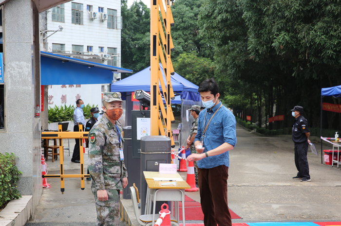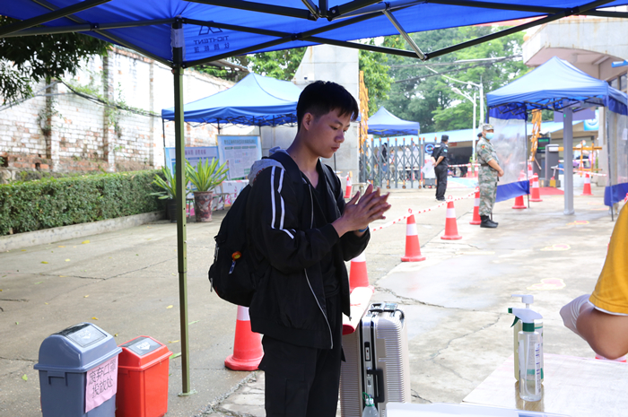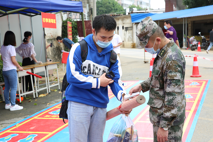 返校学生抵达,由学院相关工作人员引导入校,为确保学生健康,在各相关部门之间的工作合力下,入校流程层层把关,经过行李消杀、查看证件及健康码、测量体温、信息登记、双手消毒、更换发放新口罩等流程后进入校园。