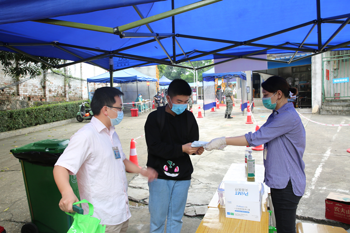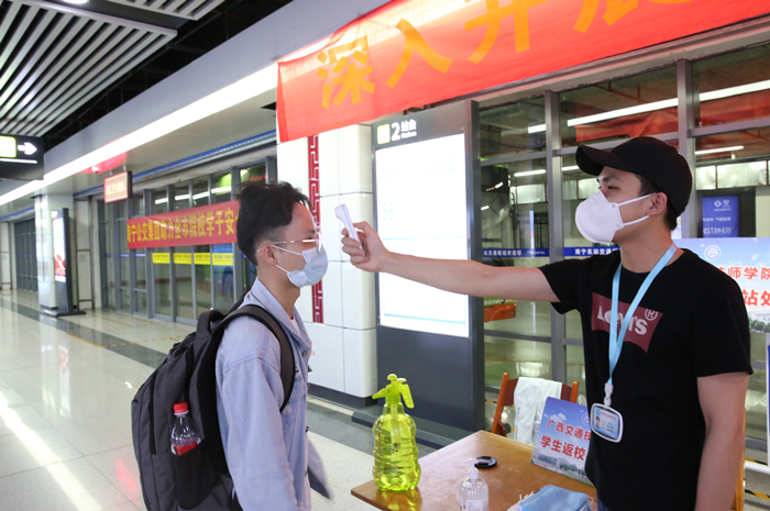 我院车站接驳人员为返校学生测量体温