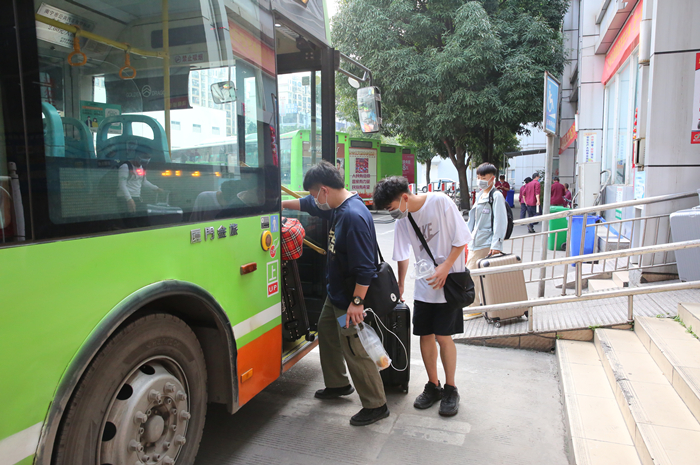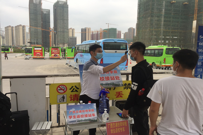以主动应对复工复产复学新形势的姿态,学院始终把学子的健康安全放在一切工作的首位,精准施策、强化责任,为确保学生安全返校,避免返校途中过多疫情接触,4月20日我院在南宁市琅东客运站、江南客运站、安吉客运站、南宁东站等7个车站设置接驳点,接送学生返校,势必为同学们健康、有序开学提供最坚实的保障。