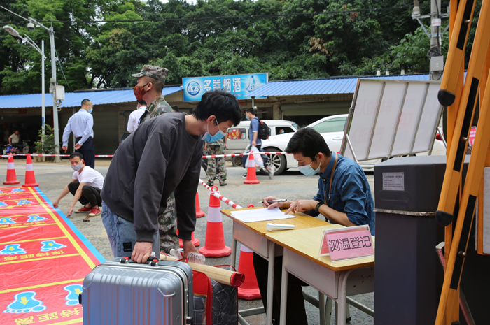 返校学生在校大门处接受体温检测并进行信息登记
