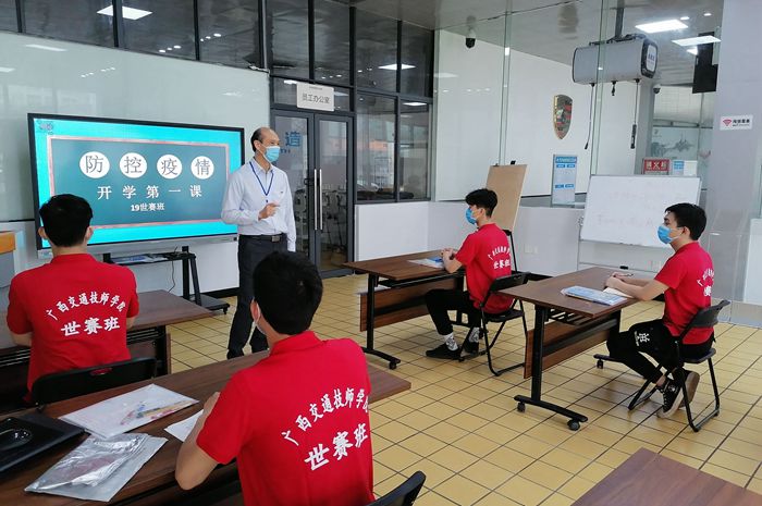 4月20日,学院精心准备了“开学复课防疫第一课”。上午9点整,世赛班的8名选手在保时捷实训教室认真听讲由学院关菲明副院长、主教练团队、班主任带来的“特殊的开学第一课”,开展爱国主义教育、卫生健康教育、心理健康教育和安全教育。引导选手们及时调整学习备赛计划,帮助他们增强自信心,理性看待疫情,为最后的冲刺训练做好准备。