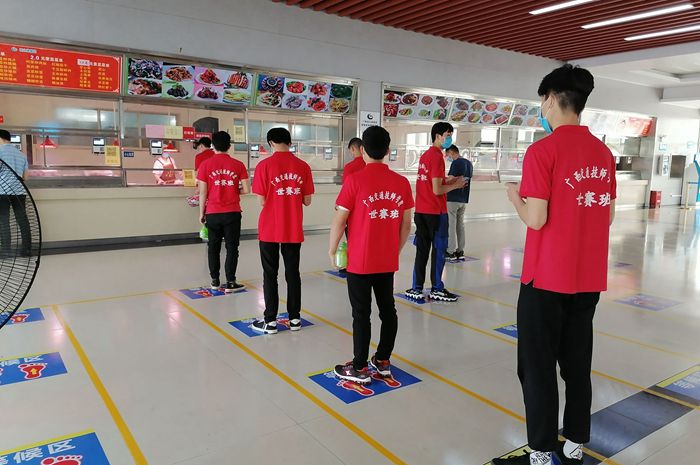 学院高度重视返校学生健康安全,每天早中晚为每位学生测量体温,并为每位学生每天配发2个口罩。宿舍配有消毒喷壶、消毒水、洗手液、体温枪等防护物资,班级负责人严格按照疫情防控复课的各项防控要求开展消毒管理工作。返校学生严格按照学院制定的分批就餐制度错时分批就餐,并按照地板标签间隔指示站位有序排队取餐。