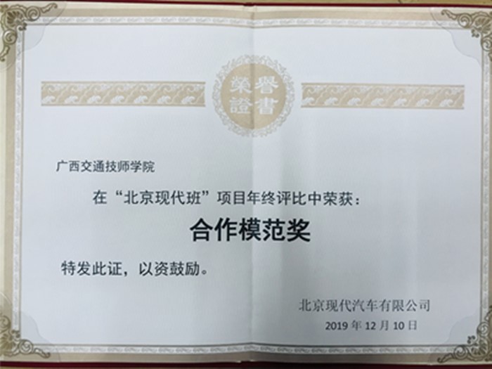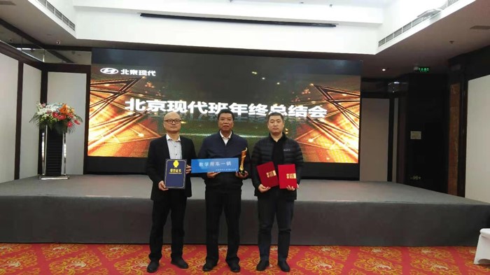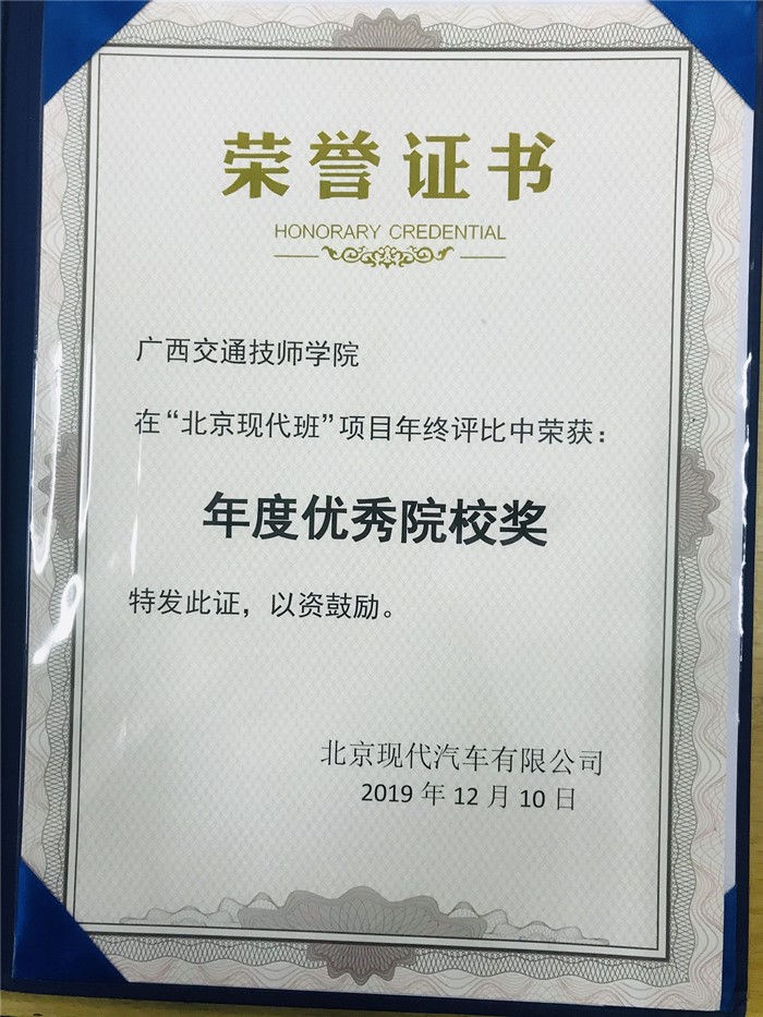 会上,北京现代汽车有限公司龙武军部长总结了2019年“北京现代班”的各项工作,他强调,北京现代班是北京现代售后服务金字塔人力资源开发体系的重要基础,是为经销商提供高技能服务人才新生力量的唯一来源。今后将加大对合作院校的支持力度,投入更多资金和设备,保证项目优质运行,进一步提升学生的培养素质,他希望合作院校深入开展对项目过程的课题研究,改进项目工作方案,促进校企合作项目的优化,并表彰了优秀合作院校。在“北京现代班”校企合作项目年终评比中,我院荣获“北京现代班”项目合作模范奖,王尧飞荣获北京现代校企合作项目“优秀教学成果奖”。同时,学院凭借完善的管理模式、扎实的办学作风,持续扩展的社会培训影响力,专业的教学团队和优异的考核成绩,荣获北京现代校企合作项目“年度优秀院校奖”、“合作模范奖”,并获赠北京现代教学用车一辆。