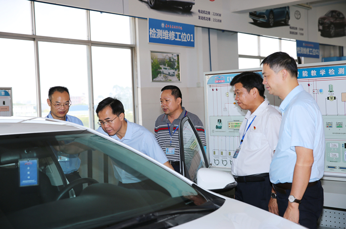 韦勇球副厅长一行先后参观了我院动车实训基地、大师工作室、汽车4S实训基地、中德诺浩培训基地、新能源汽车实训中心、保时捷汽车喷涂实训中心、烹饪专业实训基地以及幼儿教育实训室等教学实训场所。考察组对我院在实训基地建设和校园文化氛围营造等方面做出的努力和贡献表示高度赞扬。