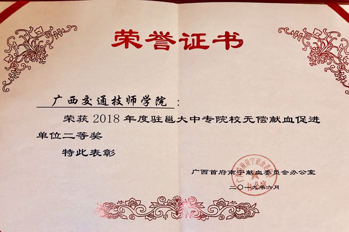 2018年我院组织了两次“爱心献血”活动,参与师生191人,献血量达59300ml。在我院校党委及学生工作科的号召下,我院广大师生奉献了自己的一份爱心,积极践行社会主义核心价值观,荣获了“2018年度驻邕大中专院校无偿献血促进单位”二等奖。