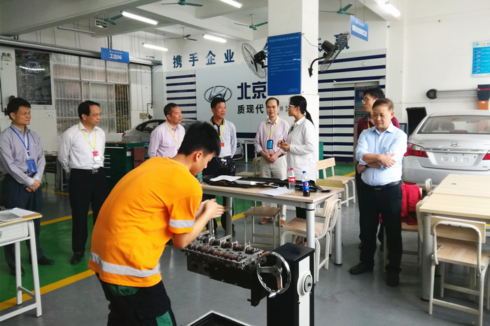 参观过程中,钟修仁院长向一行人详细介绍了学院的办学历史、办学规模和校园建设等情况。一行人先后参观了我院大师工作室、汽车维修车间、中德诺浩培训基地、汽车钣金实训中心、保时捷汽车喷涂实训中心、新能源汽车实训中心、信息化教学课堂智创体验中心以及动车实训基地等教学基地和实训设施,并对学院先进的教学理念和教学设备给予了高度称赞。