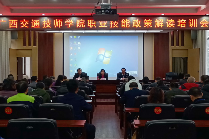 为贯彻落实习近平新时代中国特色社会主义思想,进一步办好新时代职业教育,完善教育管理方式,创新高技能人才培养模式,2019年3月7日,我院在信息中心4楼会议室召开了职业技能政策解读培训会,会议邀请了自治区人力资源和社会保障厅职业能力建设处处长杨春华、主任韦文超进行授课培训,我院中层以上领导干部及相关管理人员参加了会议。会议由院长钟修仁主持。